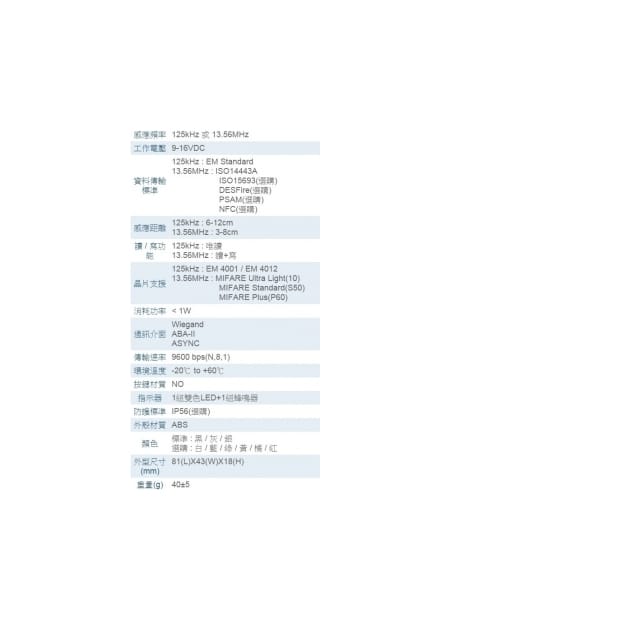 ◎ 多款絢麗色彩的外殼,可依環境需求來搭配 ◎ 可輕鬆的整合支援SOYAL和其他廠牌門禁系統 ◎ 讀頭可輸出唯根及ABA等訊號,因應控制器作調整 ◎ 1組雙色LED及蜂鳴器 ◎ 內建看門狗,自我偵測防止當機