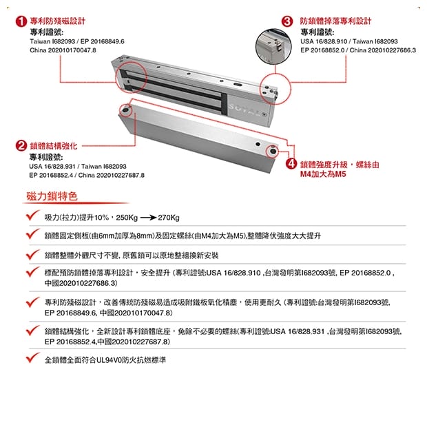 -工作電流:DC12V/DC24V -消耗電流:12VDC/500mA / 24VDC/250mA -輸出訊號:門位指示繼電器輸出(N.O/N.C/COM) -拉力:270KG(足600LBS) -工作溫度:-20度C~+80度C -鎖體尺寸(mm):251(L)x47(W)x25(H) -吸附鐵板尺寸(mm):185(L)x40(W)x15(H) -材質:鋁合金6063-T5