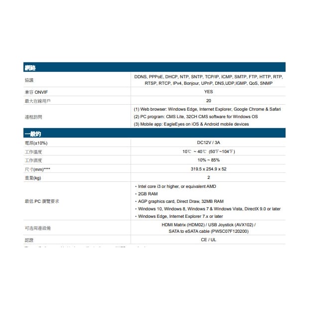 -H.265 壓縮技術 -Cloud Service - EaZy Networking -告警場景定制 -推送狀態——使用 EagleEyes 應用程序的活動事件通知 -事件彈出//預覽 -現場監視器