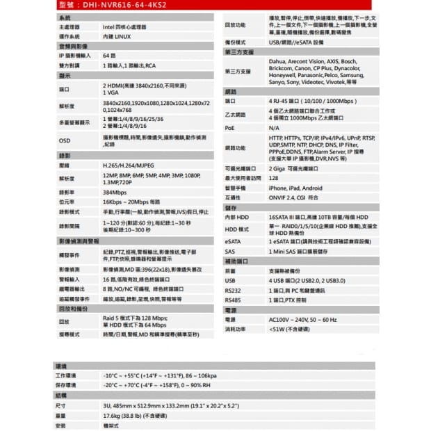 -Intel處理器 -最大64個 IP攝影機輸入 -最大384Mbps輸入頻寬 -高達12MP解析度預覽和回放 -支援RAID 0/1/5/10 -iSCSI 和 Mini SAS擴展儲存空間 -智能追蹤和智能影像
