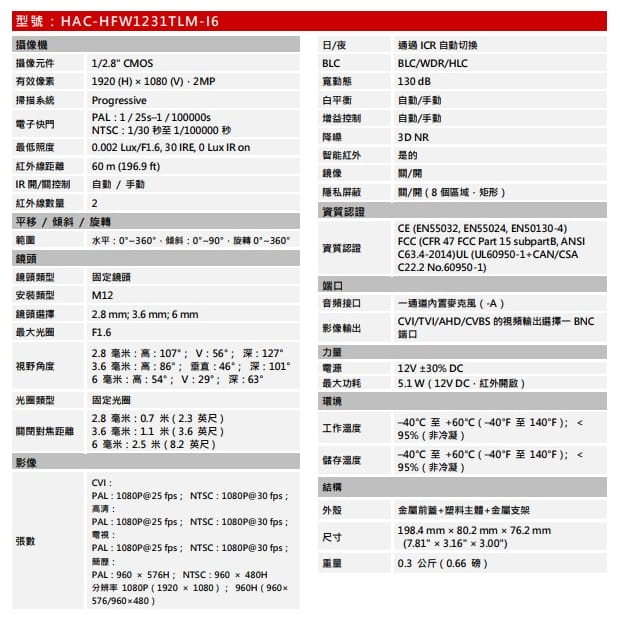 -最大 30 fps@1080P -星光,130 dB 真寬動態,3D 降噪 -3.6 毫米固定鏡頭(2.8 毫米、6 毫米可選) -CVI/CVBS/AHD/TVI 可切換 -超級適應 -內置麥克風 (-A) -最大限度。 紅外長度 60 m,智能紅外 -IP67,DC12V