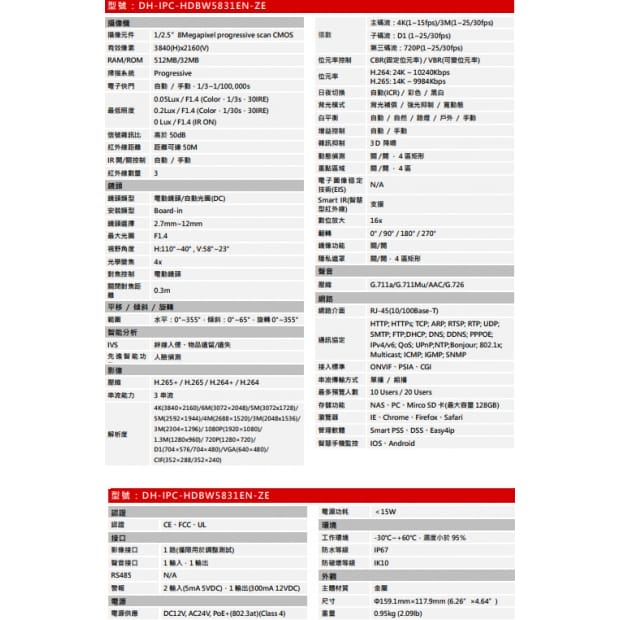 -1 / 2.5“8Megapixel逐行掃描STARVIS™CMOS -H.265和H.264雙流編碼 - 15fps@4K(3840×2160),25/30fps@3M(2304×1296) -日/夜(ICR),3DNR,AWB,AGC,BLC -多網路監控:Web瀏覽器,CMS(DSS / PSS)& DMSS -2.7mm~12mm電動鏡頭 -最大。 紅外LED長度50米 - Micro SD卡內存,IP67,IK10,PoE +