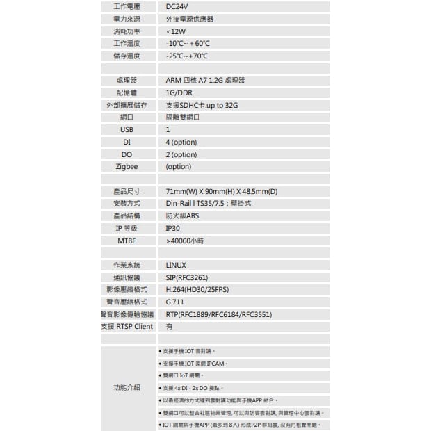 - 支援手機 IOT 雲對講。 - 支援手機 IOT 家網 IPCAM。 - 雙網口 IoT 網關。 - 支援 4x DI,2x DO 接點。 - 以最經濟的方式達到雲對講功能與手機APP 結合。 - 雙網口可以整合社區物業管理, 可以與訪客雲對講, 與管理中心雲對講。 - IOT 網關與手機APP (最多到 8人) 形成P2P 群組雲, 沒有月租費問題。