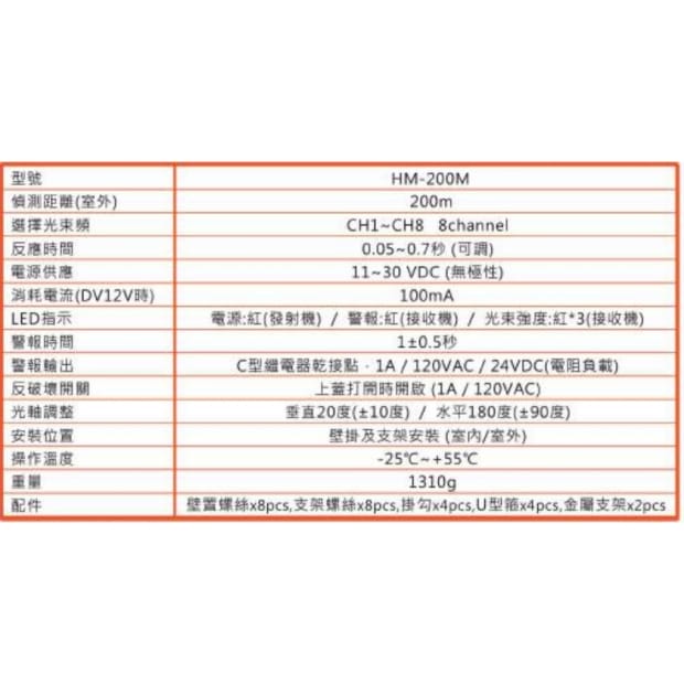 -強而有力且可靠的雙光束探測器。 - 依LED指示能不費力的微調。 - 可選擇8道光束頻率、光束堆疊、抗干擾長距離應用。 - 安裝可多達8套。 - 延遲時間可調整(0.05-0.7秒)。 - 避雷及凸波保護、自動增益控制電路。 - C型繼電器提供更多的應用。 防霜設計。 - 機體顏色結構採可見波峰值,可以不費力的準確調整光軸。
