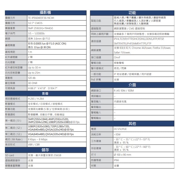 -支援 Onvif 2.6 / 防護等級 IP66 -DC12V 供電並且支援 PoE 電源規格 -支援 H.264/H.265 影像壓縮格式 -3.6mm / F1.0 Megapixel 固焦鏡頭 -支援人臉辨識 -支援 IPhone, Android, IE, Chrome, Edge -超大光圈產生更亮的影像是傳統相機的 4 倍光量 -IR LED 2 顆 / 夜視距離 30M,白光 LED 2 顆 / 夜視距離 25M