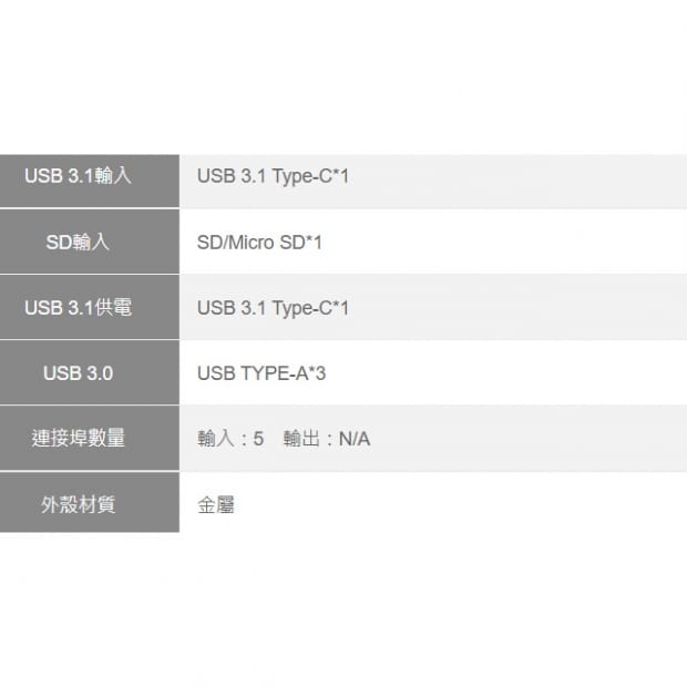 .此設備具三組USB3.0,一組SD+SD/MMC記憶卡槽,一組Type-C充電埠 .支援USB 3.0(5Gbps)超高速傳輸,向下相容USB 2.0 .USB 3.0支援同時傳輸數據與USB設備充電 .支援Macbook、chromebook pixel及其他USB3.1 Type-C等設備使用USB.C介面充電 .支援USB.C介面隨插即用、熱插拔 .支援SD/SD記憶卡 .Micro SD和SD/MMC介面無法同時運作,可以根據所持記憶卡類型選擇使用其中一種 .操作容易,攜帶方便