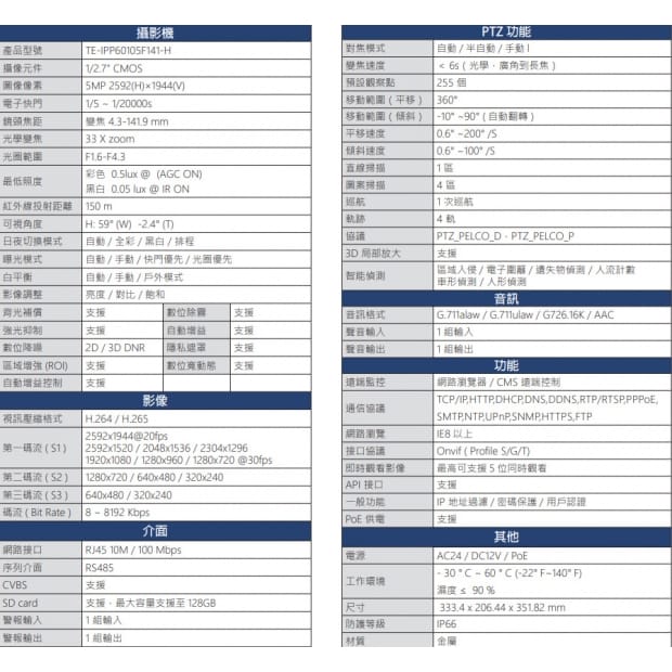 -4.3-141.9 mm 變焦鏡頭 -支援 Onvif / 防護等級 IP66 -支援 H.264 / H.265 壓縮格式 -DC12V 供電並且支援 PoE 電源規格 -最低照度 0.05Lux -智慧型紅外燈 , 投射距離可達 150 公尺 -支援智能偵測功能區域入侵 / 電子圍籬 / 遺失物偵測 /人流計數 / 車形偵測 / 人形偵測