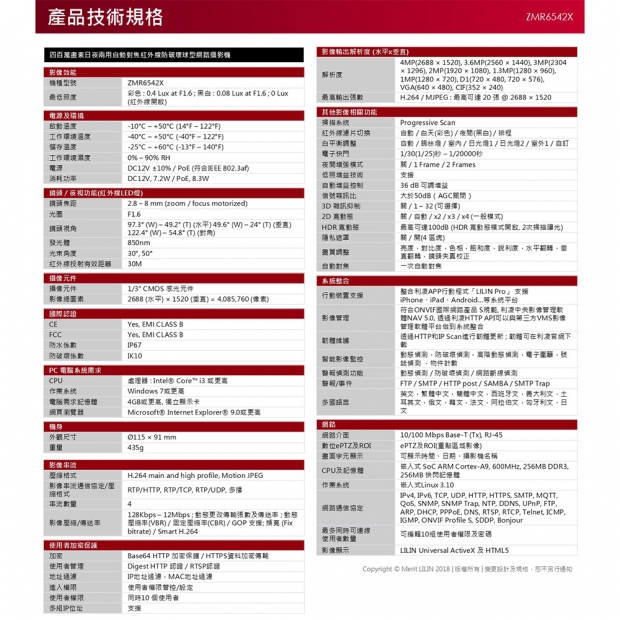 LILIN 利凌 ZMR6542X 400萬畫素 紅外線 H.264 日夜兩用 自動對焦 防破壞球型網路攝影機