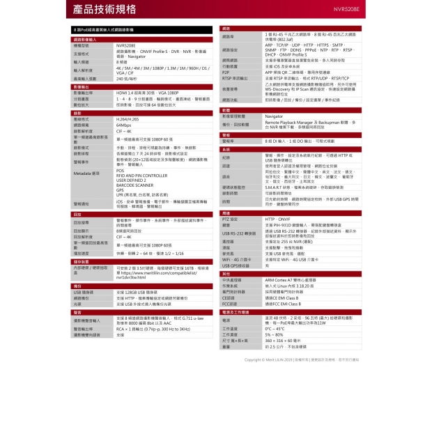 -輸入 8 頻道 H.264/H.265 網路攝影機 -支援 4K H.264/H.265 網路攝影機 -支援 1080P 60張 超高速網路攝影機 -HDMI 1.4 4K 30張、VGA 1080P 輸出 -行動裝置及 Navigator點對點專用序號連線 -網路輸入頻寬可達 -行動裝置 iOS、安卓系統支援 -8 埠 PoE 乙太網路供電路介面支援網路攝影機隨插即用 -多瀏覽器⽀援 Chrome、Edge、Firefox、IE、Opera、Safari ⽀援GPS通訊