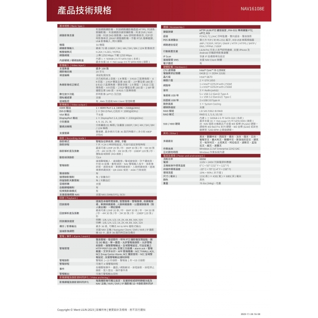 -108路1080P/3M/4M/5M/8M/12M網路即時影像輸入, 錄影 -內建 1 × 500GB 2.5吋 SATA SSD (系統) -最多支援 16 × Hot-swap 3.5吋 SATA HDD (錄影) -支援容錯移轉36門 -支援雙串流模式 -雙螢幕, 最多總共可達36路同時顯示 -支援多路影像同步回放及備份 -支援魚眼影像校正 -內建2.5GbE 雙網路埠, RJ-45 × 2 -內建800W Redundant 1+1 -標準3U尺寸