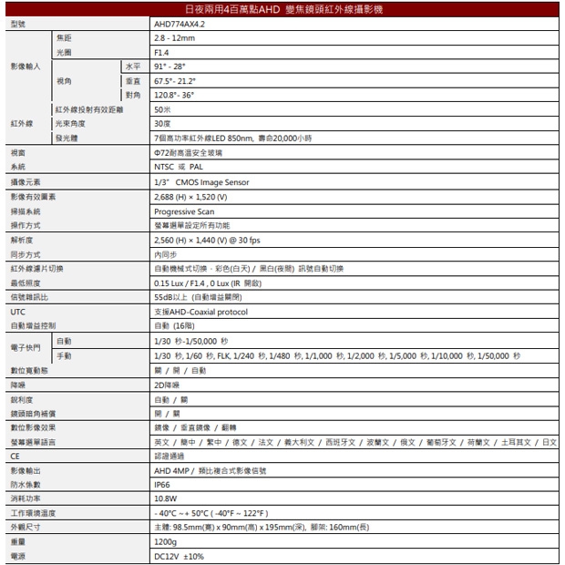 LILIN 利凌 AHD774AX4.2 400萬畫素 日夜兩用 AHD 變焦鏡頭紅外線攝影機