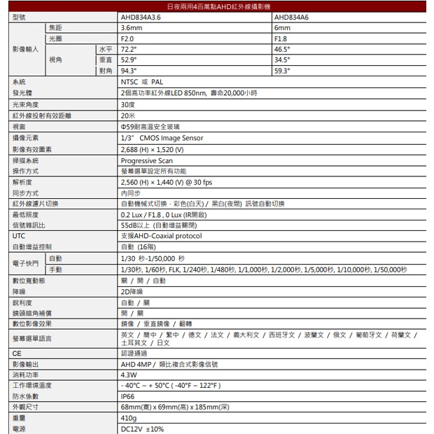 雙影像輸出: AHD 4MP 或類比複合式影像信號