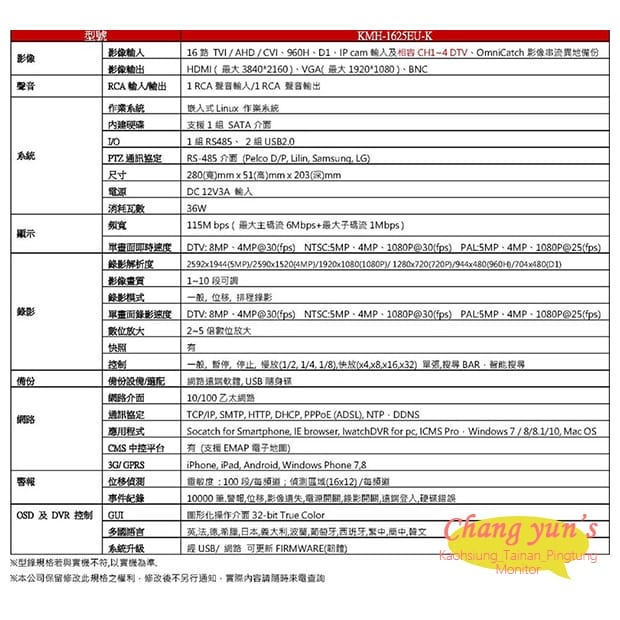 -支援IPC 、AHD、TVI、CVI、960H/D1及 DTV 各式攝影機訊號。