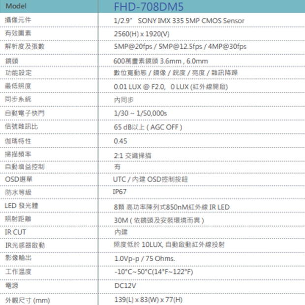UTC功能,可由DVR主機直接操控攝影機選單 TVI 5MP / AHD 5MP / TVI 4MP / AHD 4MP 輸出選擇 內建IR CUT濾光鏡片,日夜同焦更清晰 高透光高清六百萬畫素鏡頭 8顆高功能陣列式紅外線LED,照射距離最遠達30米 搭配光電晶體,讓IR啟動時間更一致,免除掉光敏電組的不穩定性