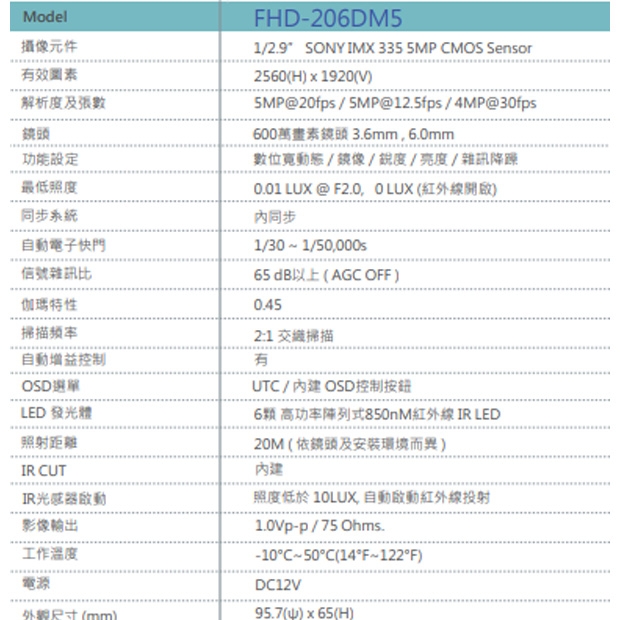 UTC功能,可由DVR主機直接操控攝影機選單 TVI 5MP / AHD 5MP / TVI 4MP / AHD 4MP 輸出選擇 內建IR CUT濾光鏡片,日夜同焦更清晰 高透光高清六百萬畫素鏡頭 6顆高功能陣列式紅外線LED,照射距離最遠達20米 搭配光電晶體,讓IR啟動時間更一致, 免除掉光敏電組的不穩定性