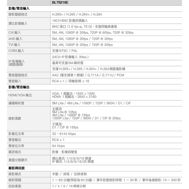 CVI / AHD / TVI / CVBS 影像訊號⾃動辨別輸入 最⾼可⽀援6/12/24 頻道6M 網路攝影機輸入 透過UTP 和同軸電纜進⾏遠距離傳輸: 720P CVI 影像控制訊號可傳送距離到1,200M、 1080P CVI 影像控制訊號⽀援影像傳送距離到800M、 4K/4M CVI 影像控制訊號⽀援影像傳送距離到700M ⽀援全頻道同軸⾳頻傳輸