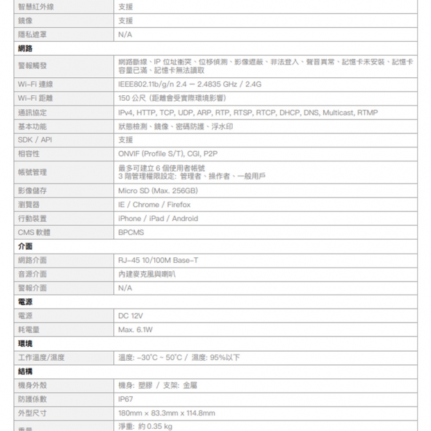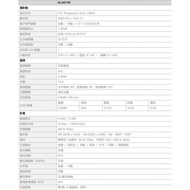 4M ⾼清解析度 4M (2560 x 1440) @ 20fps、3M (2304 x 1296) @ 30fps 2.8MM 定焦鏡頭 H.265 影像壓縮格式 智慧紅外線,夜視有效距離達30 公尺 ⽀援位移偵測、遮蔽偵測、聲⾳異常偵測 ⽀援數位寬動態 (DWDR) 3D 數位降噪 內建麥克風 IP67 防⽔等級 ⽀援Wi-Fi (2.4G WI-FI 覆蓋約150 公呎範圍開放空間)