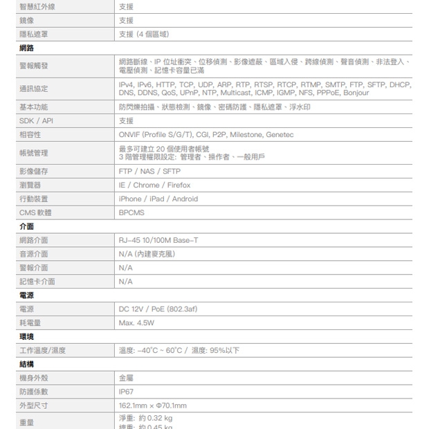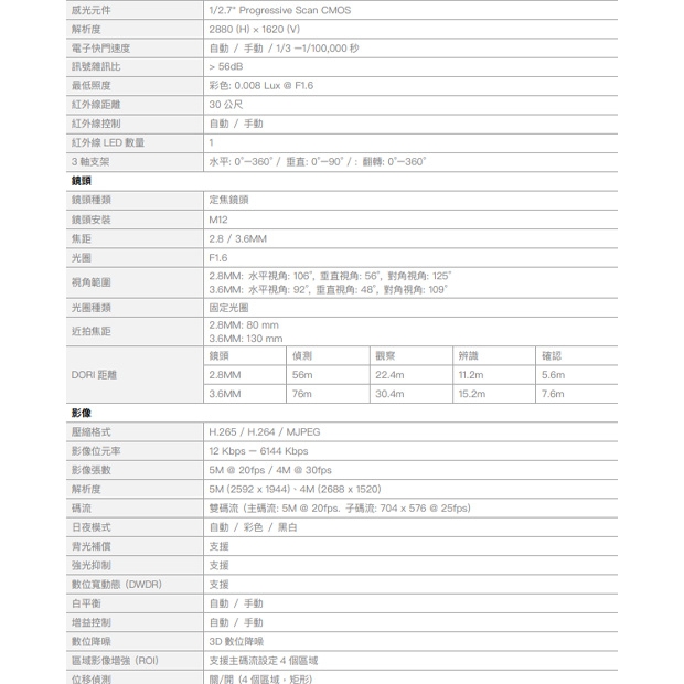 5M ⾼清解析度 5M (2880 x 1620) @ 20fps / 4M (2688 x 1520) @ 30fps 2.8 / 3.6MM 定焦鏡頭 H.265 影像壓縮格式 智慧紅外線,夜視有效距離達30 公尺 區域影像增強,可設定4 個區域 ⽀援數位寬動態 (DWDR) 3D 數位降噪 內建麥克風 PoE 網路供電 IP67 防⽔等級