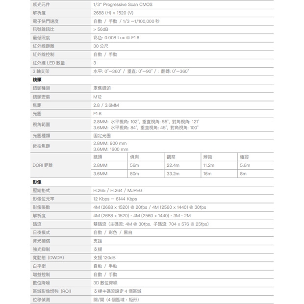 4M ⾼清解析度 4M (2688 x 1520) @ 20fps / 4M (2560 x 1440) @ 30fps 2.8 / 3.6MM 定焦鏡頭 H.265 影像壓縮格式 智慧紅外線,夜視有效距離達30 公尺 智慧偵測: 區域入侵、跨線偵測、位移偵測、遮蔽偵測 區域影像增強,可設定4 個區域 ⽀援寬動態 (WDR) 120dB 3D 數位降噪 PoE 網路供電 IP67 防⽔等級