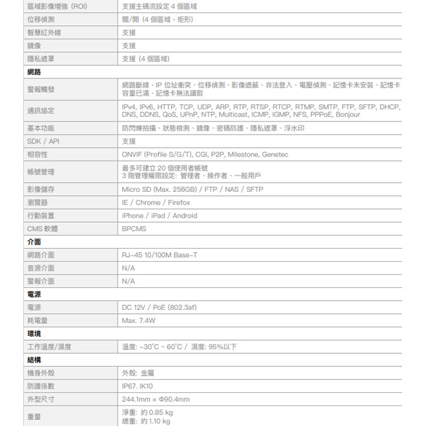 4M ⾼清解析度 4M (2688 x 1520) @ 20fps / 4M (2560 x 1440) @ 30fps 2.8 -12MM 電動變焦鏡頭 H.265 影像壓縮格式 智慧紅外線,夜視有效距離達50 公尺 智慧偵測: 位移偵測、遮蔽偵測 區域影像增強,可設定4 個區域 ⽀援寬動態 (WDR) 120dB 3D 數位降噪 PoE 網路供電 IP67 防⽔等級 IK10 防暴等級