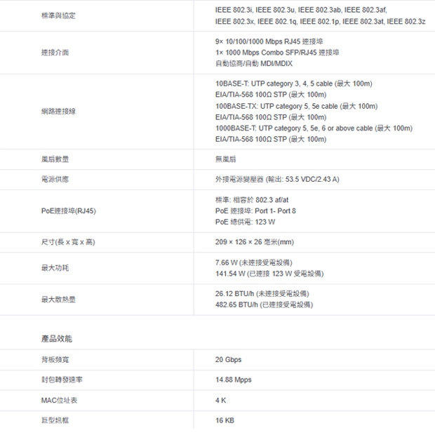 具備 8 個 802.3af/at PoE+ 連接埠,每埠最高提供 30 W,交換器可透過單一網路線同時傳輸資料和電力