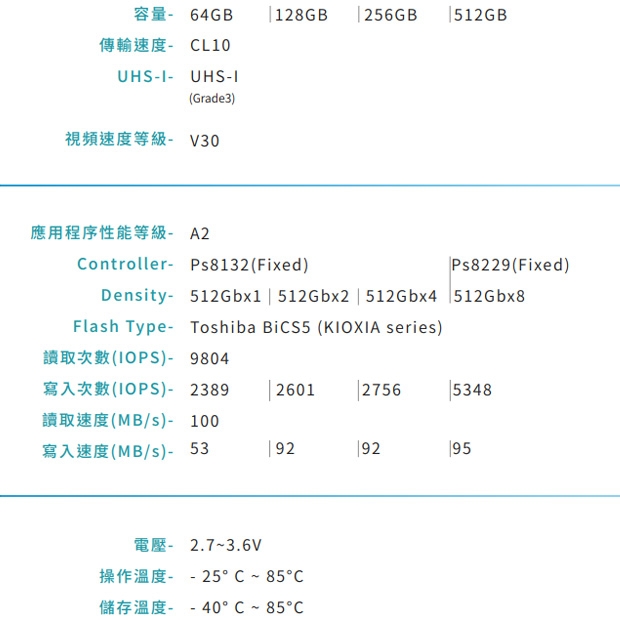 工業級卡片 強化錯誤碼校正 特殊耗損平均技術 錯誤區塊管理 開關讀寫保護 可透由近端無線傳輸方式檢視記憶卡健康狀態達到警示管理。 可透過 Vacron 具有 Panel 設備,即時顯示記憶卡健康狀態。 記憶卡本身產生健康記錄狀態存查。 可透由雲端方式檢視記憶卡健康狀態達警示管理。